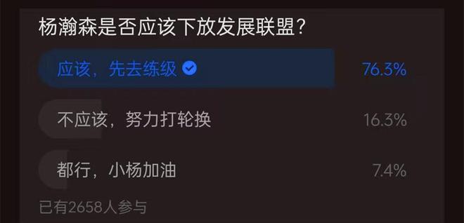 新赛季至今场均仅给5.6分钟登场时间,场均只能拿到2分,杨瀚森是否应该早点去G联赛练级?超千人票选结果一边倒。