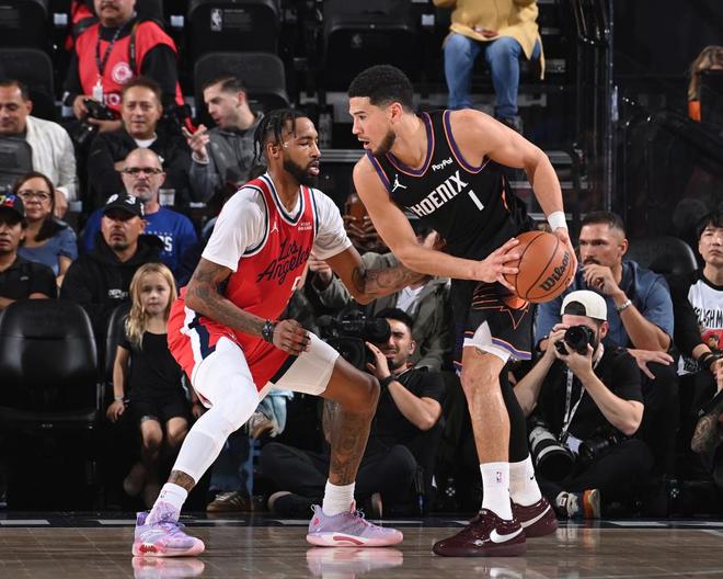 次节比赛,快船一波6-0攻势追平比分,古德温与吉莱斯皮各中一记三分回敬,祖巴茨补篮与空接暴扣连得4分,科林斯2+1反超1分。狄龙与古德温各中一记三分,快船继续冲击内线追分,布克接连两次上篮与吉莱斯皮3记三分命中,快船连续三分不中,快船单节17-25再输8分,上半场结束快船46-60落后太阳。前两节比赛,快船三分14中1疯狂打铁,全队没有球员得分上双,太阳三分22中10,布克13+7+7与吉莱斯皮4记三分12分。