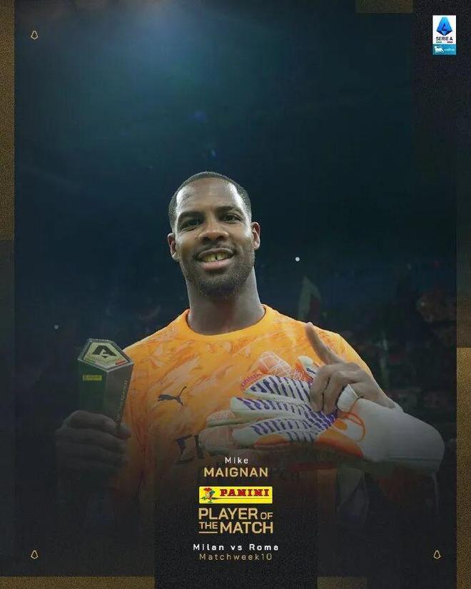 在本轮意甲,米兰1-0击败罗马。本场比赛米兰门将迈尼昂发挥出色,贡献7次扑救,赛后他也当选意甲官方评选出的本场最佳球员。